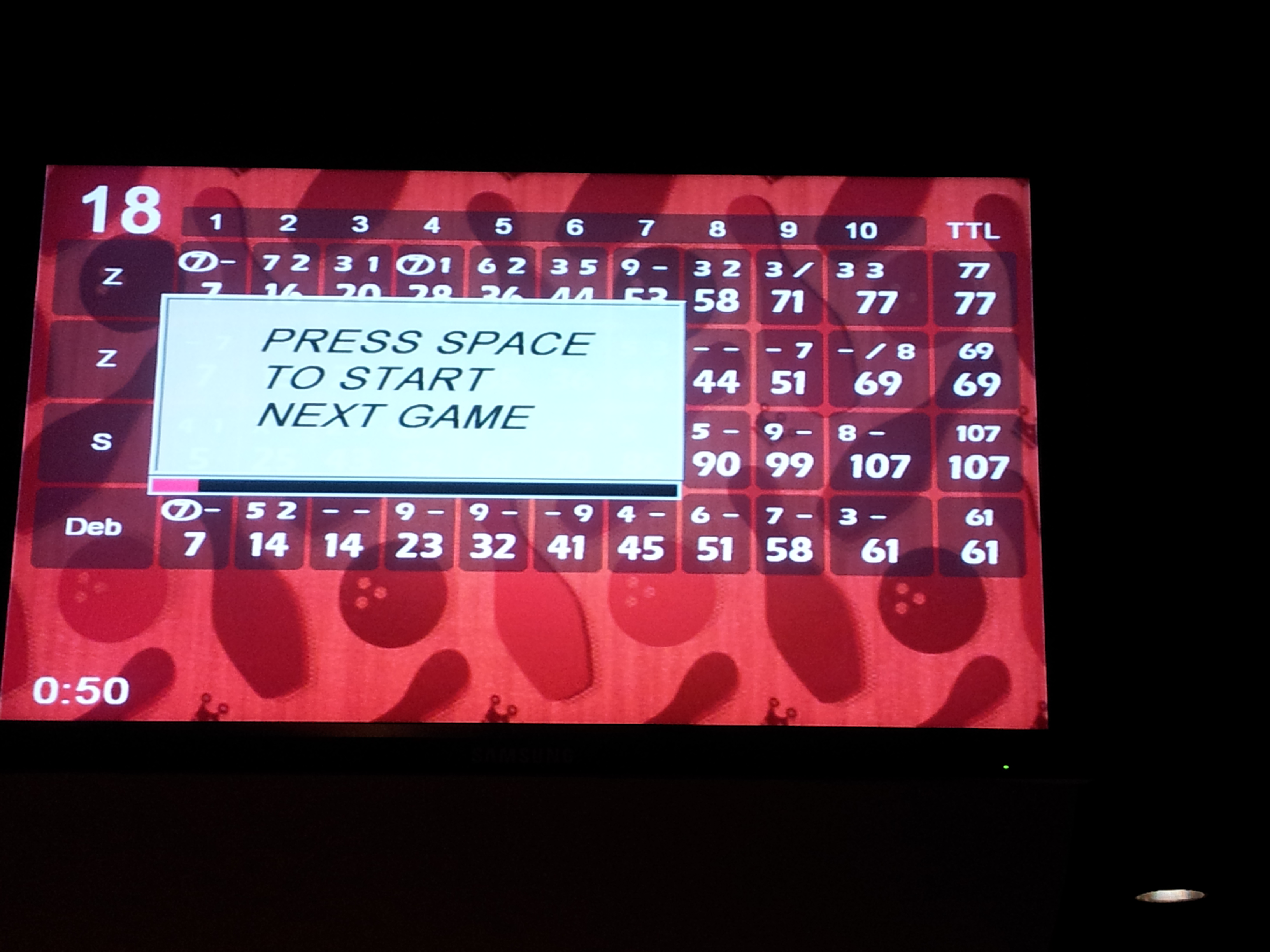 Once Deb arrived, we asked to be seated at a table so that we could order something to eat. Even here we opted for a pizza and burgers. The food was pretty good and our waiter (whose name I don’t remember) was awesome! Not long after we finished eating, our pager buzzed to let us know a lane was ready for us! We got our shoes and were escorted to our lane which was on the second level. I hadn’t bowled in years, but we had a great time! With four people, we were given an hour and a half to bowl. I didn’t do that well in any of the games we completed, but I enjoyed hanging out with Deb!