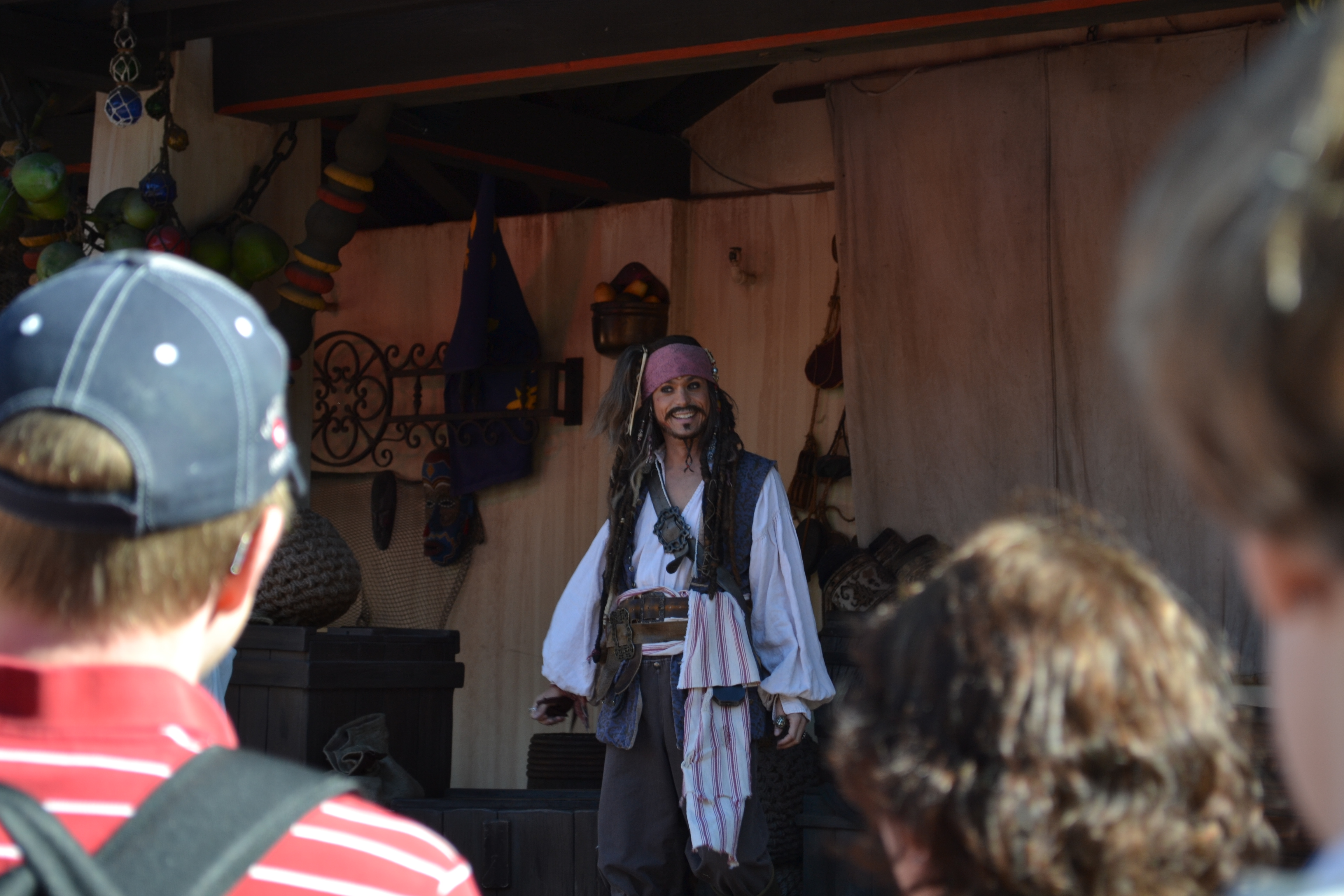 It still wasn’t time to go back to Big Thunder Mountain Railroad, so I checked on the wait time for Pirates of the Caribbean. It was only 20 minutes so of course we headed that way. The Jack Sparrow Pirate Tutorial show was just beginning, but I really had no interest in seeing it other than taking a picture of Jack Sparrow. Check!