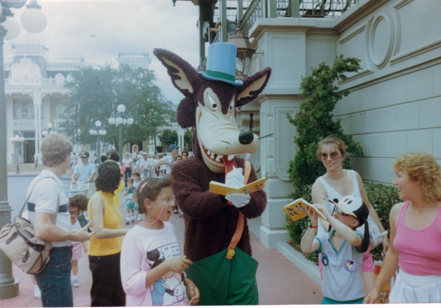 This photo is from my very first visit to Walt Disney World in 1986! Apparently even then I was the one who was taking pictures of our vacation. Out of almost 100 pictures that I’ve found so far from this trip, I have yet to find myself in a single photo! My sister is that girl with glasses and the pink shirt standing next to the character….whom I can’t recall. Is that the fox from Pinocchio??