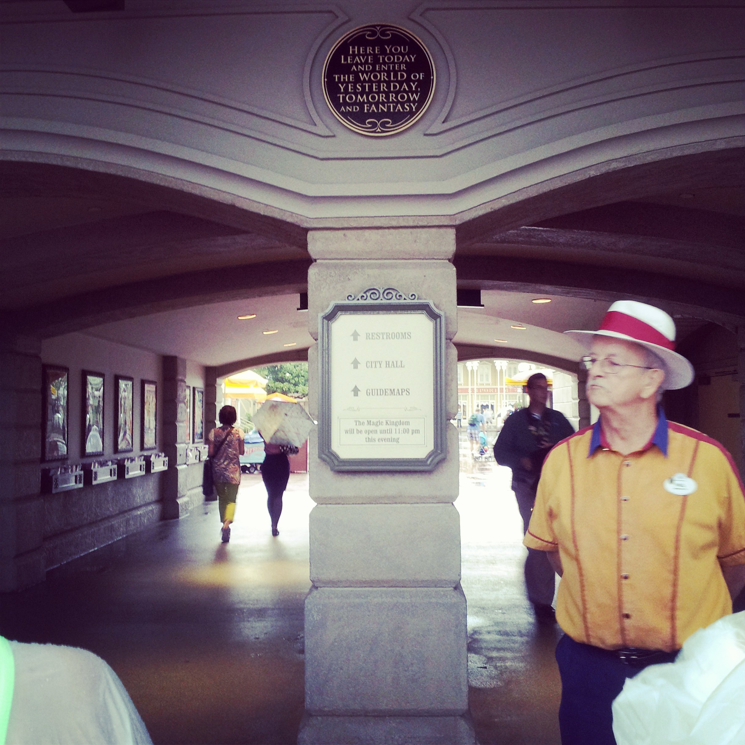 It was raining once again so I made sure to take my umbrella. Turns out Shari isn’t a fan of people like me carrying umbrellas in the parks…hee hee. But while we stood waiting for the park to open, I started getting tired of holding the umbrella up. On my last trip, it didn’t rain enough for me to have to hold the umbrella for a long time and I didn’t really think about that when I opted to take my umbrella and leave all of my rain ponchos at home. It didn’t take long for me to realize that it was going to be raining all day and I knew I wasn’t gonna want to tote the stupid umbrella around all day. So, despite the fact that I had more than one poncho at home (and I really didn’t want to add to that collection), I went ahead and got both of us Disney Parks rain ponchos. It was raining too much for them to do the opening ceremony that includes characters, the Walt Disney World Railroad and a Family of the Day, so I took some photos while we waited to get into Magic Kingdom.