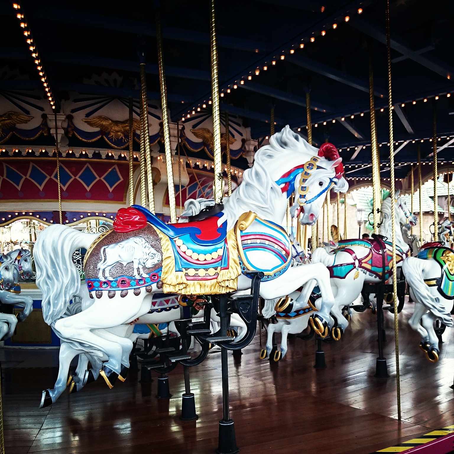 I’d already forgotten all of the high point targets for this ride so my score wasn’t that great, but it was still fun trying to get a good score! Once we were done here, Cynthia and I went back towards Fantasyland while Shari and Maria either went to get a drink or maybe went to the smoking area. I don’t actually remember. What I do remember is that I convinced (or maybe the correct word is forced…) Cynthia to ride Prince Charming’s Regal Carousel. She didn’t really want to ride because there were mostly adults taking little kids on the ride but I told her it didn’t matter. We rode it despite having trouble climbing on and off of the carousel horses. I got a shot of an almost empty carousel as the previous riders exited and before they allowed us to get on.