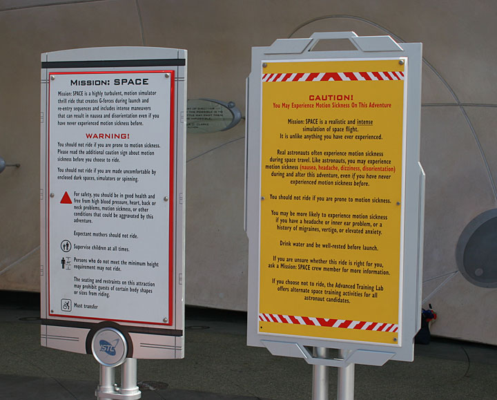 Let me be clear, I hardly remember anything about the queue at Mission: SPACE. I’m sure it’s well themed and really cool looking, and as someone who used to love all things space, I probably thought at the time that it was awesome. I even vaguely recall that there was a pre-show of some sort that probably gave back story and some instructions. BUT…all of that got pushed out of my memory and all that remains are the warning signs we encountered all the way leading up to the ride vehicle.