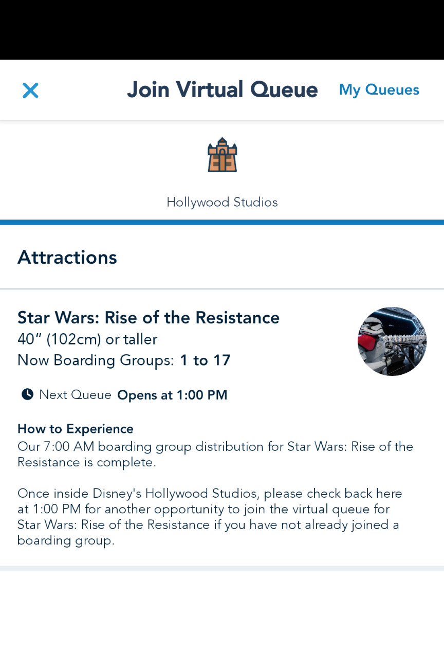 Darn…or some similar word… I was disappointed, but I knew there was so much more to do at Hollywood Studios and we weren’t only there to get on Rise of the Resistance. I started to back out of the app and my screen went to the My Queues page where I saw this: