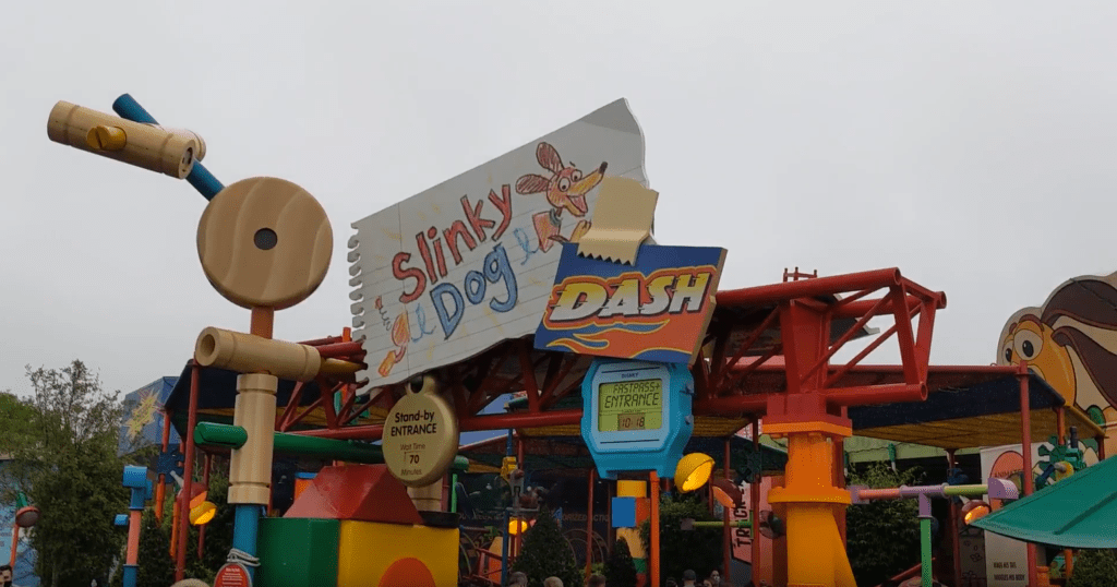 Once we were done there, I checked the My Disney Experience app for the wait time of Slink Dog Dash and remarkably, it had gone down to 55 minutes so we went ahead and got in line there. I also checked the virtual queue for Rise of the Resistance and it showed we were estimated to get called back there in around 50 minutes so it would work out perfectly to ride Slinky and then be ready to head to Galaxy’s Edge after that.