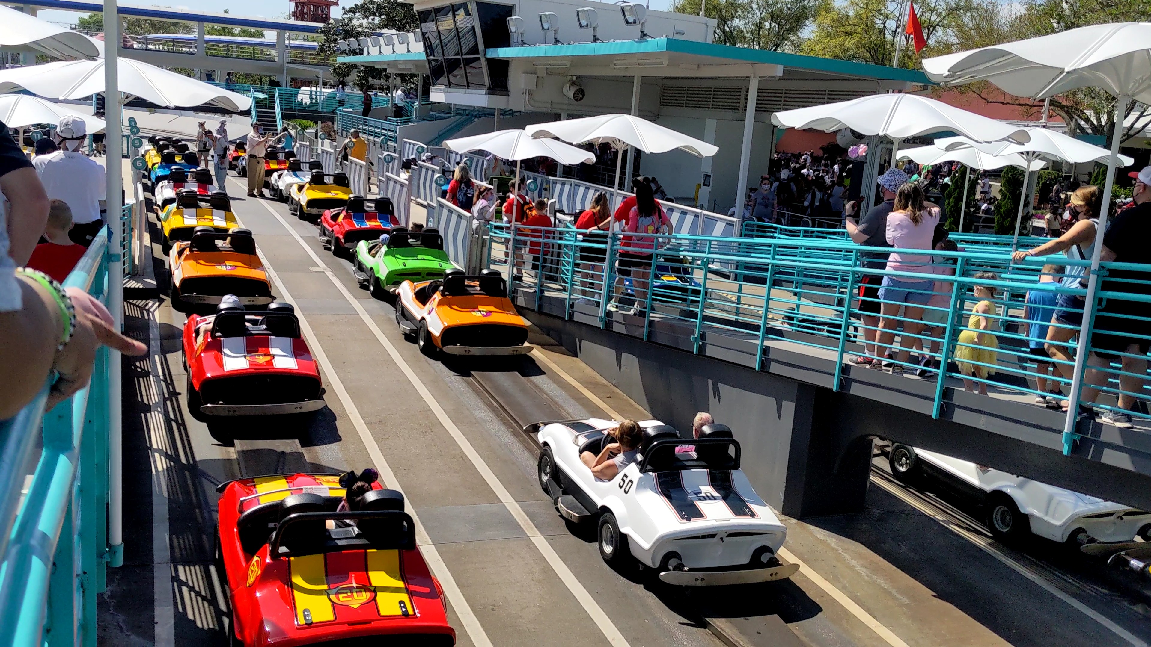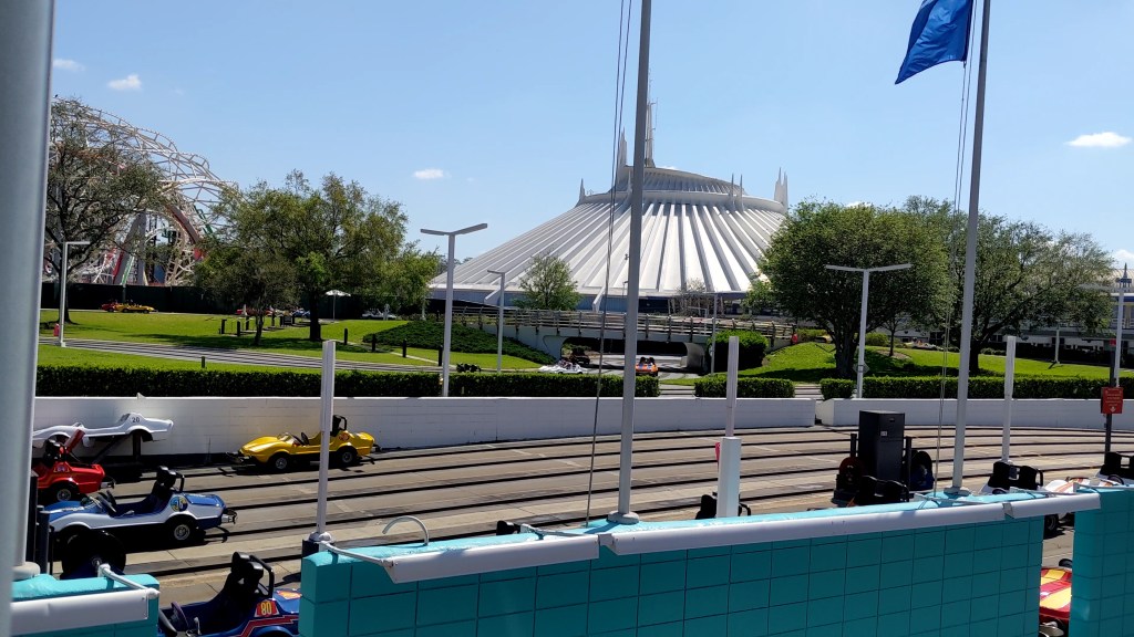 After Peter Pan, we walked a bit before ending up at the cusp of Fantasyland and Tomorrowland. We decided to ride Tomorrowland Speedway before we had lunch. I don’t remember the people behind us getting too close to us in this line, but I did end up getting hit from behind twice when I was in my speedway car, but it might have been a kid that didn’t know how to control the car enough to avoid hitting me. I didn’t look to see and it really didn’t matter.