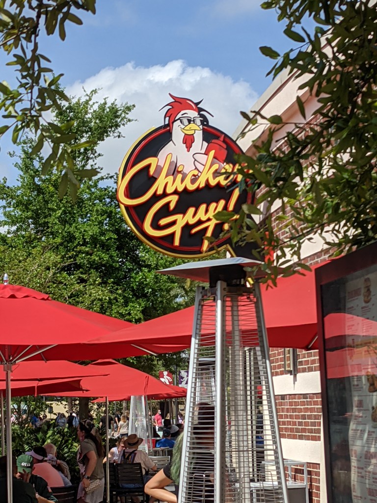 Anyway, all of this was to point out that with Chastity’s feet hurting her so much, we ended up not doing as much as we originally planned at Disney Springs. We got to Disney Springs around 11:30 that morning and we went to see how the line was at Aerophile but we found that it was closed at the time because the wind was too high. Since we had a late start that day, we decided to go ahead and get something to eat. Chicken Guy was close to where we were so we ended up eating there.